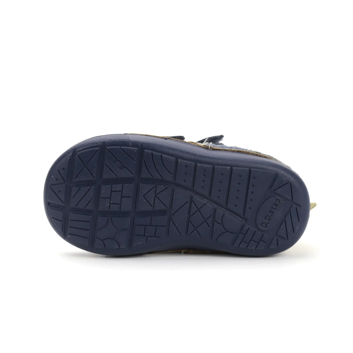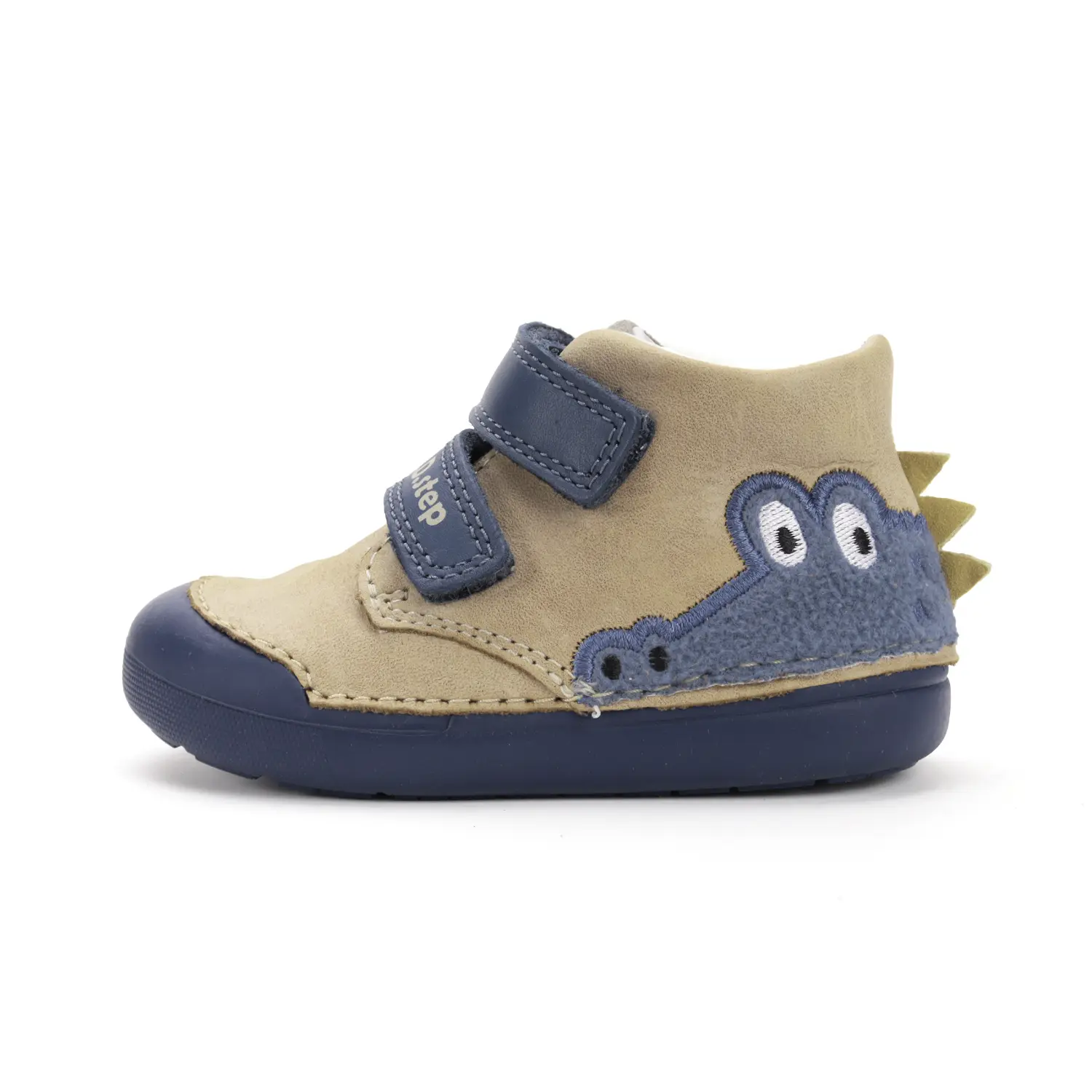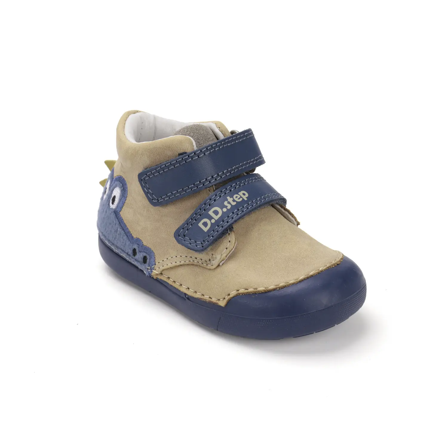 Trzewiki dziecięce DDstep w kolorze kremowym z niebieską aplikacją w kształcie krokodylka to idealne buciki dla dzieci, które dopiero zaczynają stawiać swoje pierwsze kroczki. Buty dedykowane są na stopy normalne oraz szerokie z wyższym podbiciem. Ten model wykonaliśmy w całości ze skóry naturalnej, posiadają także skórzaną, wyjmowaną wkładkę.